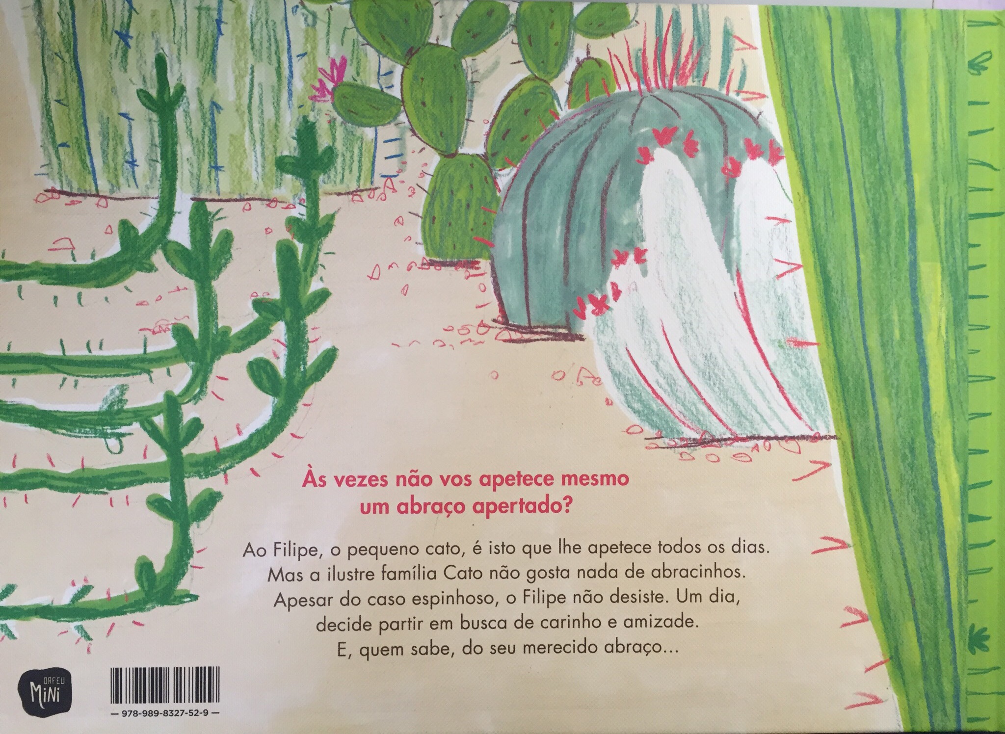 Às vezes não vos apetece mesmo um abraço apertado? Ao Filipe, o pequeno cacto, é isto que lhe apetece todos os dias. Mas a ilustre família Cacto não gosta nada de abracinhos e despreza qualquer tipo de manifestação de afecto. Apesar do caso espinhoso, o Filipe não desiste. Um dia, decide partir em busca de carinho e amizade. E, quem sabe, do seu merecido abraço…